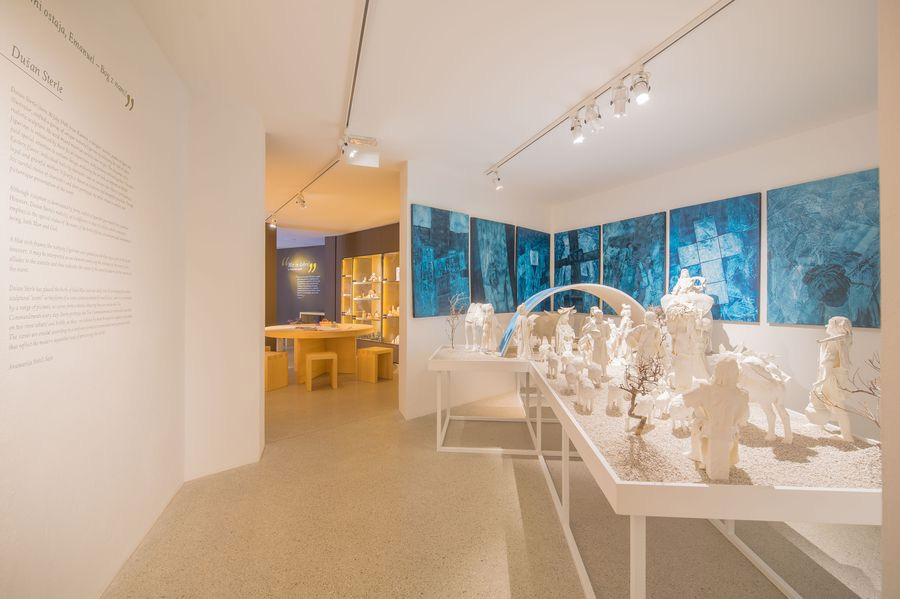 Čeprav ima v kiparstvu svoje dominantno mesto forma, ravno pri jasličnih figurah pogosto nastopajo barvne dopolnitve. Jaslice Dušana Sterleta so drugačne. Bele. S tem je želel poudariti poseben status dogodka Jezusovega rojstva, rojstva tega nedolžnega, čistega bitja, Človeka in Boga.